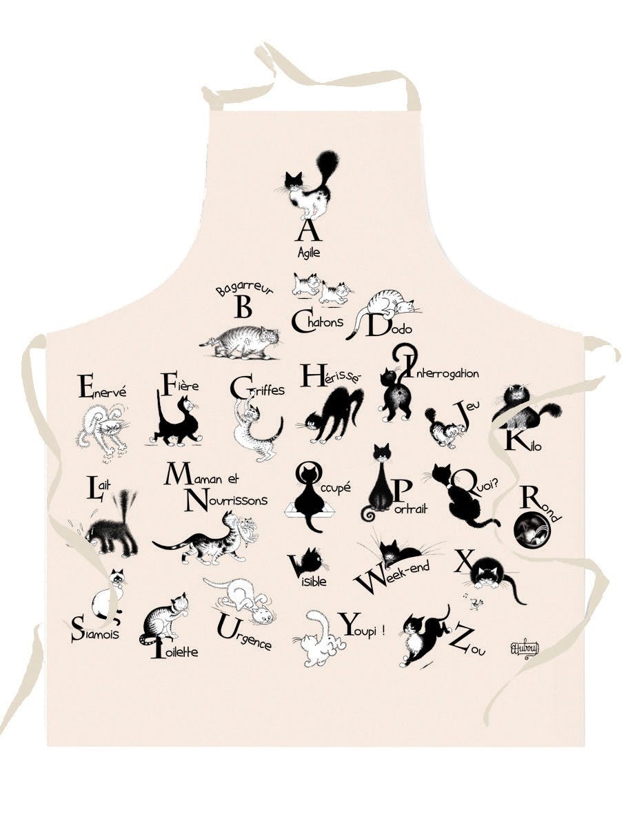 Als je een fan bent van de cartoonist Dubout, zul je zijn potloodstreep graag terug vinden door het “ABC” -schort bedrukt met het alfabet en katten. Dit 100% katoenen schort en gemaakt in Frankrijk, zal je in stijl beschermen. Dit schort is even mooi als praktisch en kan op 40° gewassen worden. En voor een 100% gepersonaliseerde decoratie, maak je dit schort compleet met theedoeken, handdoeken en de handschoen / pannenlap set uit het DUBOUT assortiment.